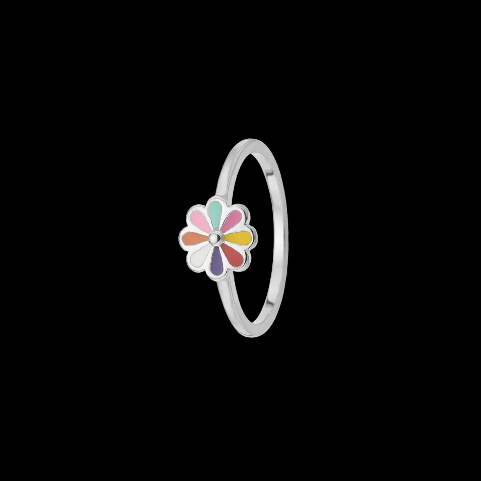 Sød lille børne ring med blomst, blade på blomsten er i forskellige farver. Ringen er fremstillet i sterling sølv og er fra det danske smykke brand Aagaard.