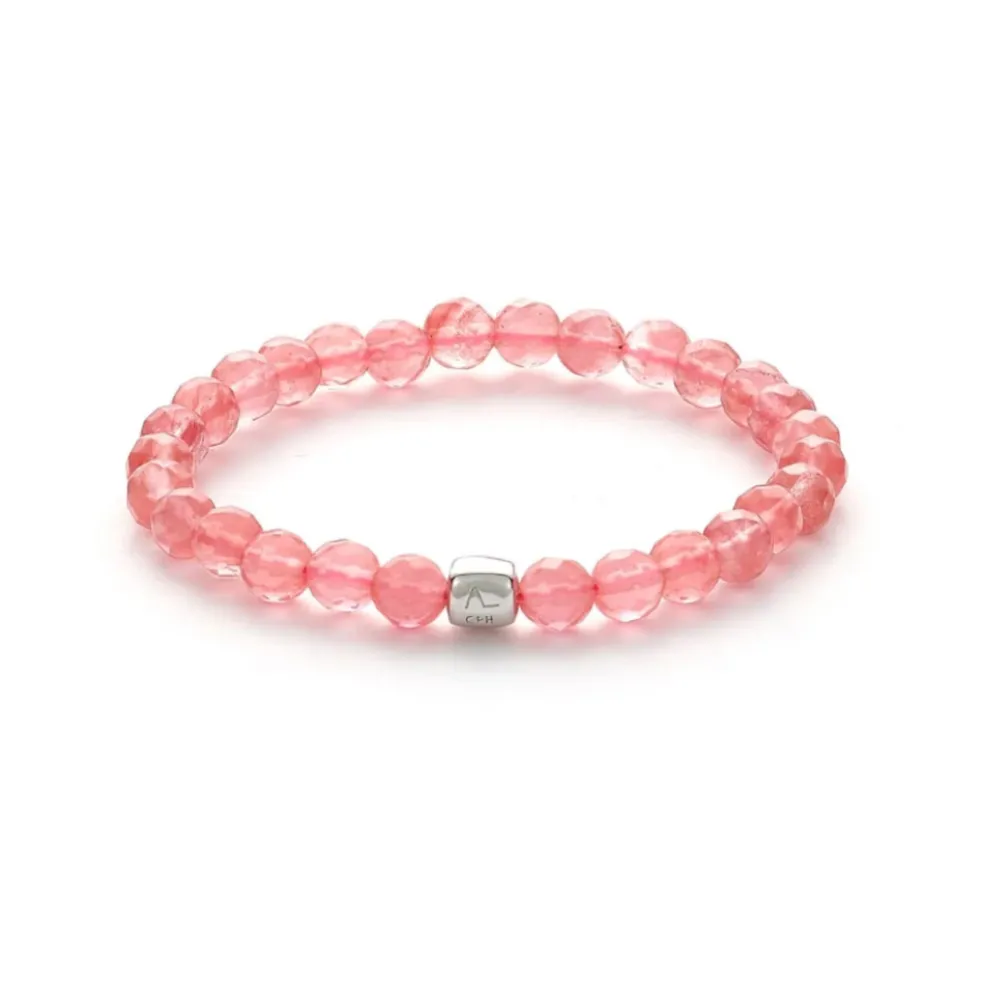 Lad din stil skinne med dette smukke armbånd fra Alexander Lynggaard. Fremstillet med facetslebne cherry quartz-sten, der reflekterer lyset smukt. Dette armbånd har en feminin og elegant finish der passer til ethvert outfit. Stenene måler 6 mm i diameter og er kombineret med en 6 mm logo-terning i rhodineret sterlingsølv 925. Opspændt på en slidstærk elastisk silikonesnor sikrer armbåndet en behagelig pasform, der glider let på håndleddet. Perfekt som gave til en særlig kvinde – ideel til både hverdag og fest.