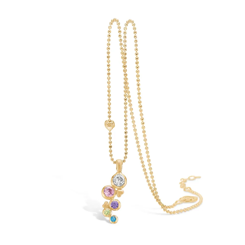 Denne smukke halskæde fra Blossom Copenhagen kombinerer elegance med legende detaljer. Vedhænget har en let matteret overflade, hvilket giver det et moderne og stilfuldt udtryk. Udsmykningen består af multifarvede zirkonia i forskellige størrelser, der tilføjer et strejf af farve og liv. De små hjerte-detaljer på vedhænget gør designet endnu mere unikt og feminint.