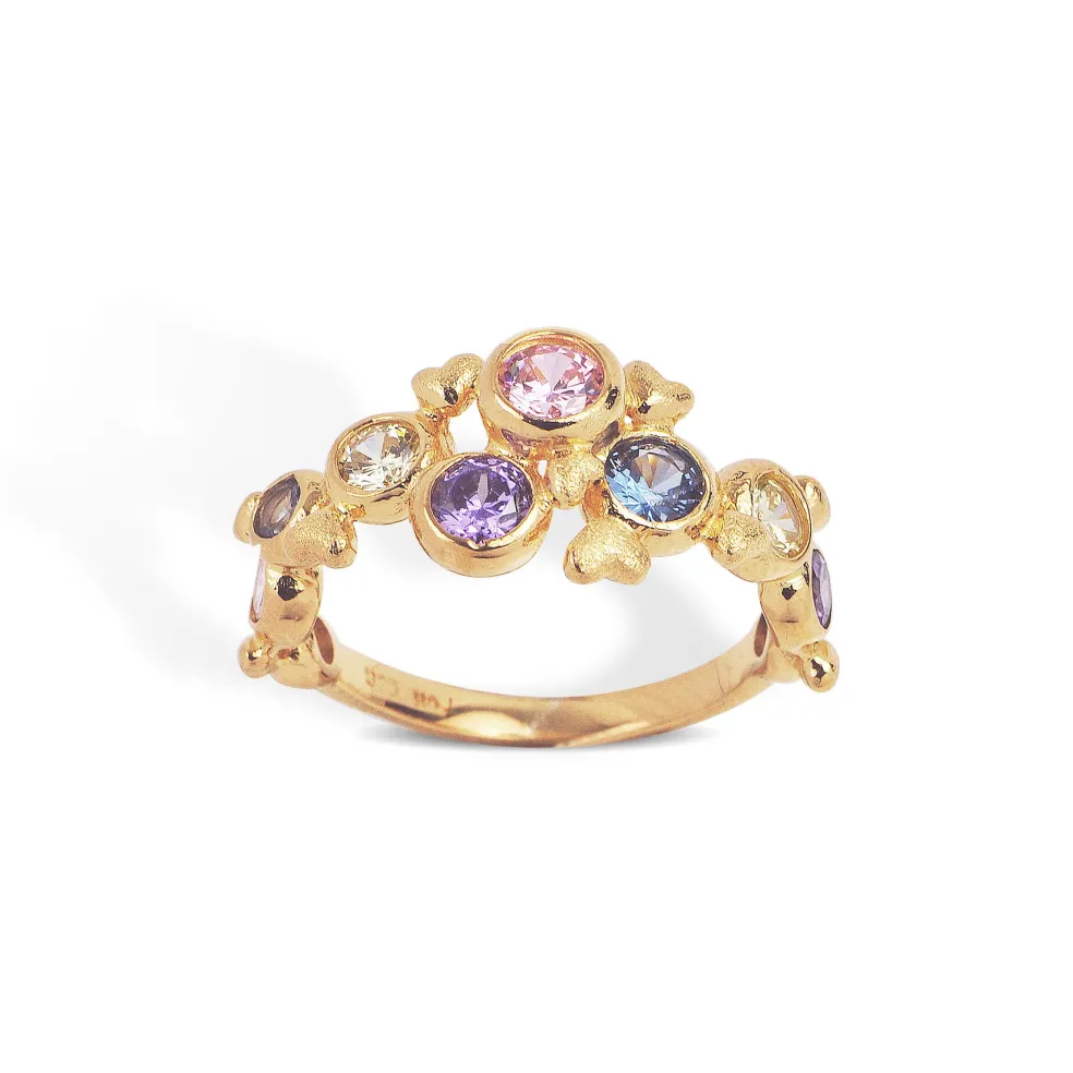 Smuk guldbelagt sølv ring fra Blossom Copenhagen. Ringen er med et mix af forskellig farvede sten af zirkonia. Ringen har små søde hjerte detaljer som giver et rigtigt smukt udtryk ved siden af de farvede sten i rør fatning.