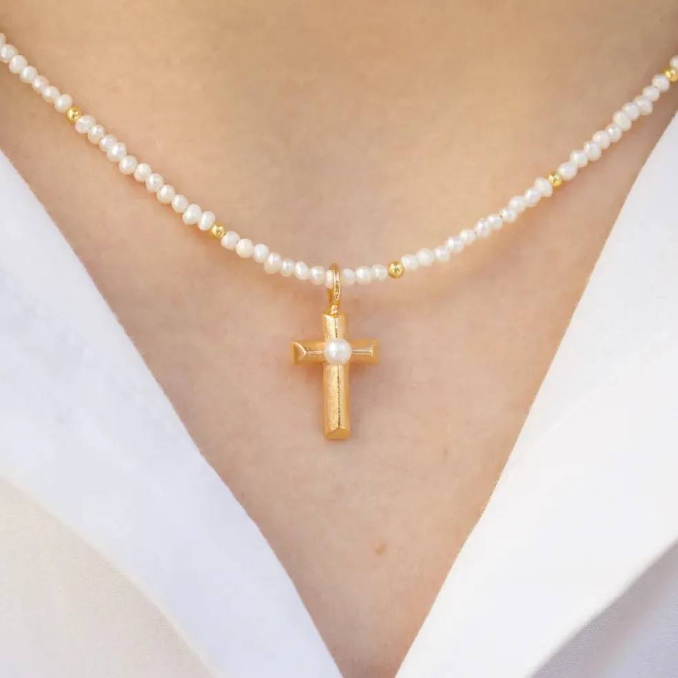 Ferskvandsperle halskæde med forgyldte kugler og kors fra Blossom Copenhagen. Vedhænget er et kors vedhæng med en 3,5mm ferskvandsperle. Selve halskæden er med små unikke ferskvandsperler hvor der imellem er sat små sølv forgyldte kugler.