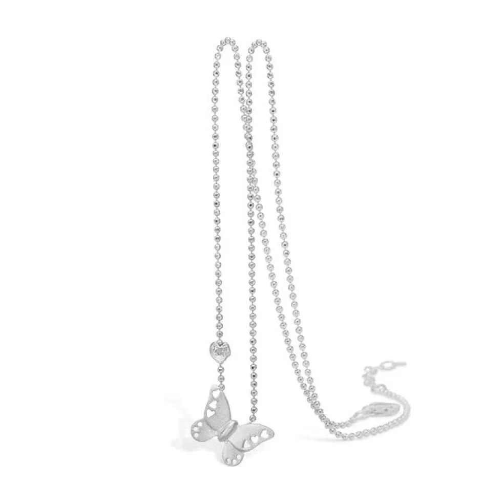 Sølv halskæde med sommerfugl. Kæden er en kuglekæde med et lille hjerte midt på kæden. Sommerfuglen er med små hjerter på vingerne.