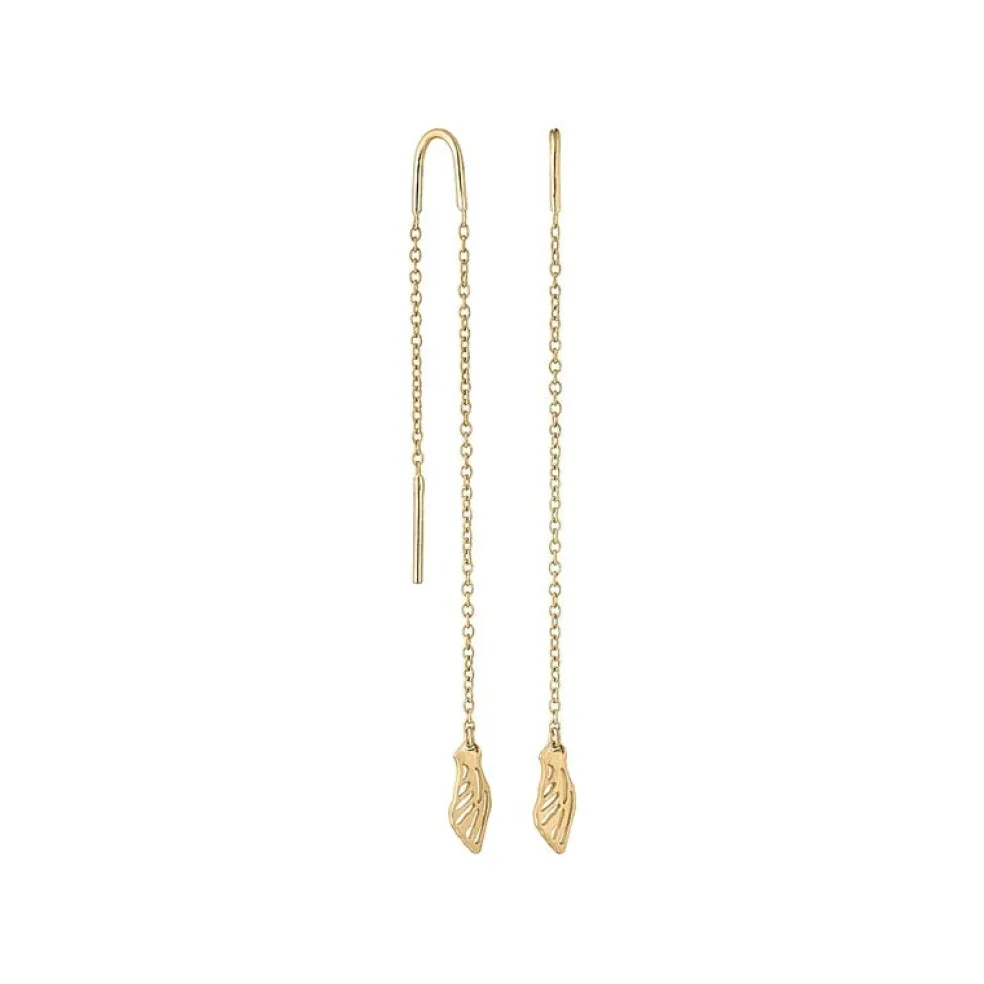 Sølv forgyldt ørehænger med kæde og et blad med mønster. Midt på kæden er der en bøjle der gør at øreringen hænger bedre. Øreringen er designet at Vicky Joé for Blossom.