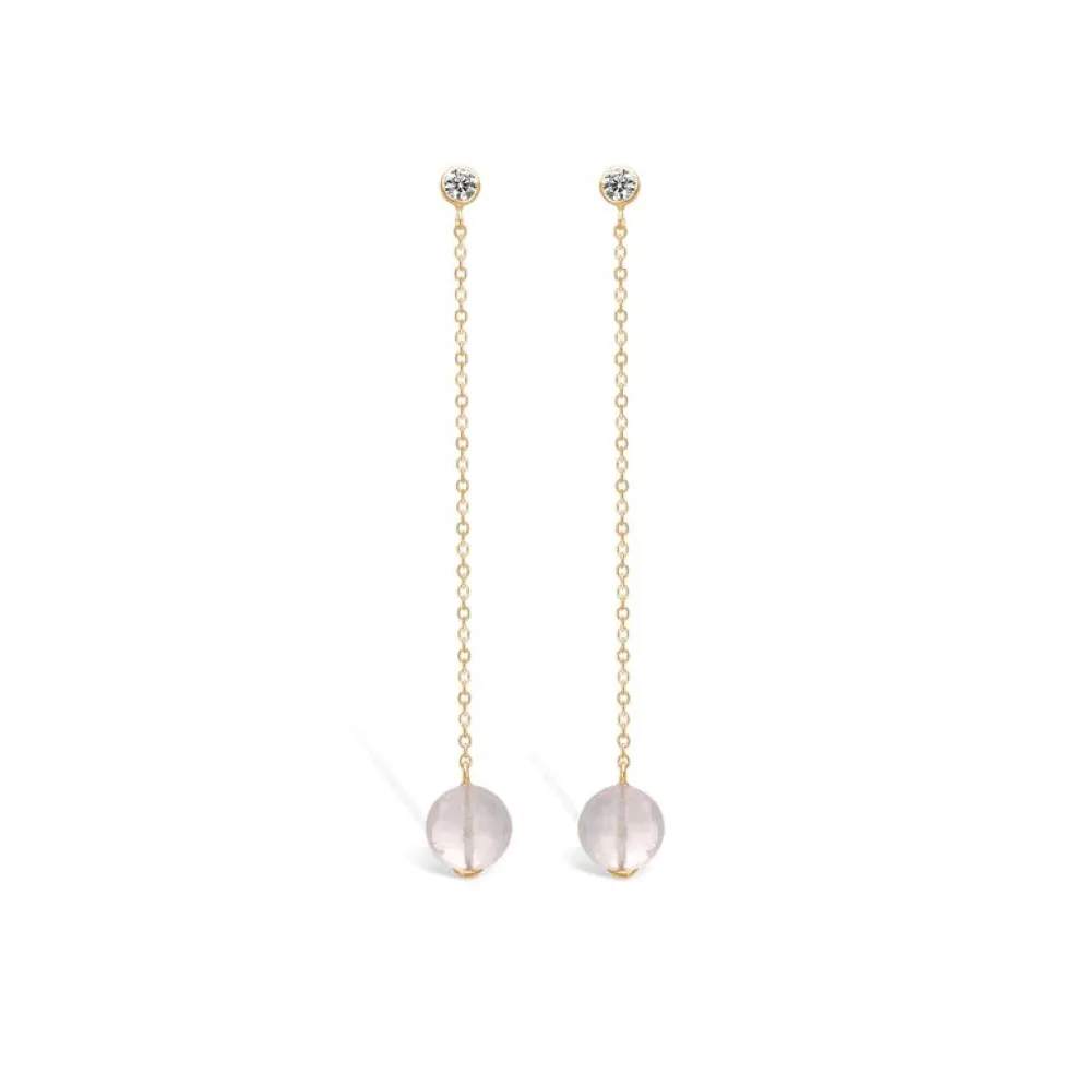 Sølv forgyldt ørestikker med kæde. Øreringen er en hænge ørering med en fin sart rosa kvarts. Stenen er facetslebet så lyser beder kan reflektere . På stikken sidder der en lille fin zikonia sten. Øreringe er 6,5cm lang.