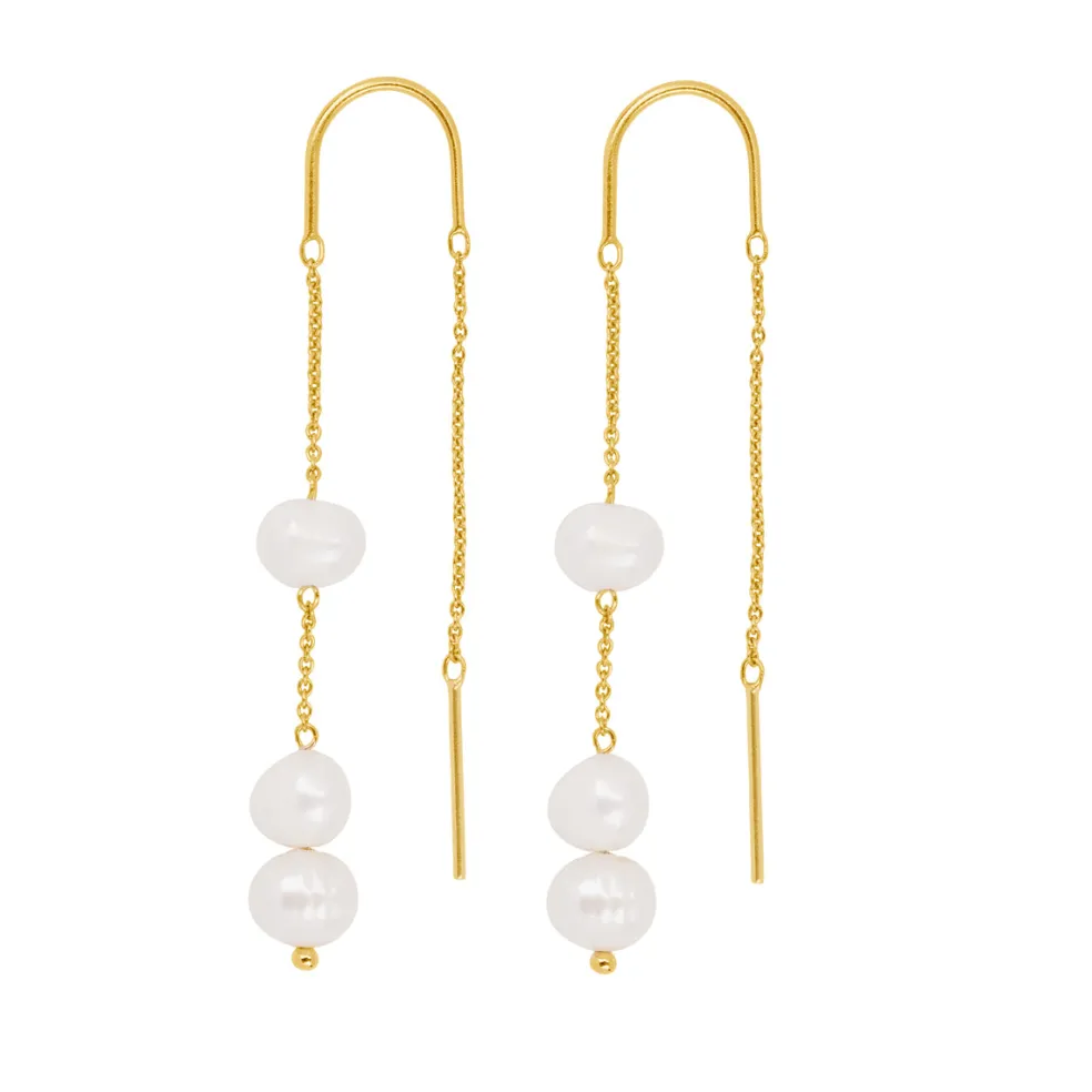 Sølv forgyldte ørehænger med kæde og fast bøjle. På kæden hænger der 3 perler. 2 sidder tæt sammen og 1 hænger lidt fra de andre, så man kan se et stykke kæde.