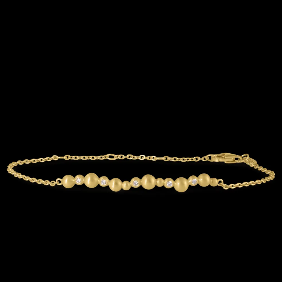 Produktbeskrivelse: Det elegante Pebbles armbånd fra Bybiehl er en udsøgt kombination af klassisk design og moderne elegance. Fremstillet i 14 karat guldbelagt sølv, er armbåndet udsmykket med glitrende zirkonia-sten og designet med kugler i forskellige størrelser, der skaber et unikt og sofistikeret look.