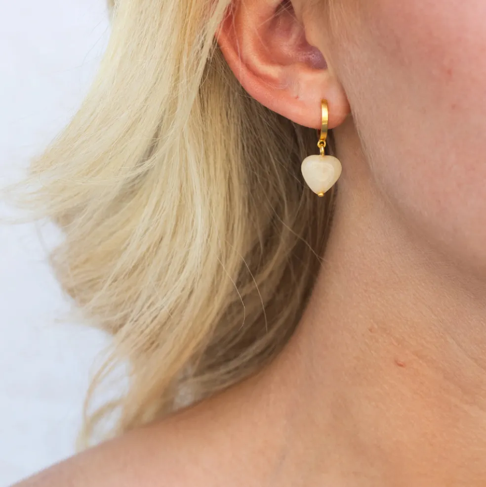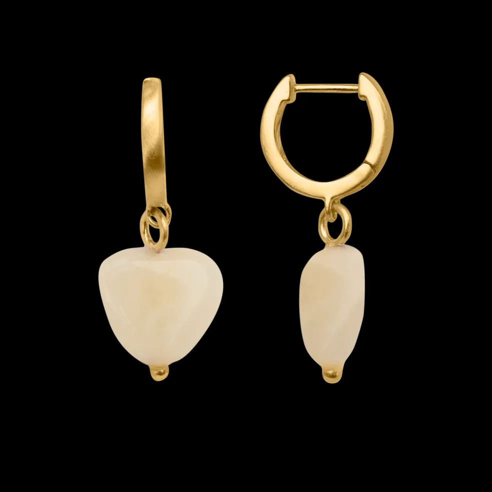 Soft Heart Creoler med Gul Jade: byBiehl Soft Heart creoler med gul jade. Disse øreringe, der er en del af Soft Heart kollektionen, fremhæver din personlige stil med deres smukke, gyldne farvetone. Øreringene er fremstillet af byBiehls unikke metalblanding, belagt med 14 karat guld for en luksuriøs glans. Med et praktisk klik-låssystem er de nemme at tage af og på, og de sikrer en behagelig pasform. Creolerne måler 10 mm i diameter, og det tilhørende hjertevedhæng af gul jade måler også 10 mm, hvilket skaber en perfekt balance mellem klassisk og moderne design.