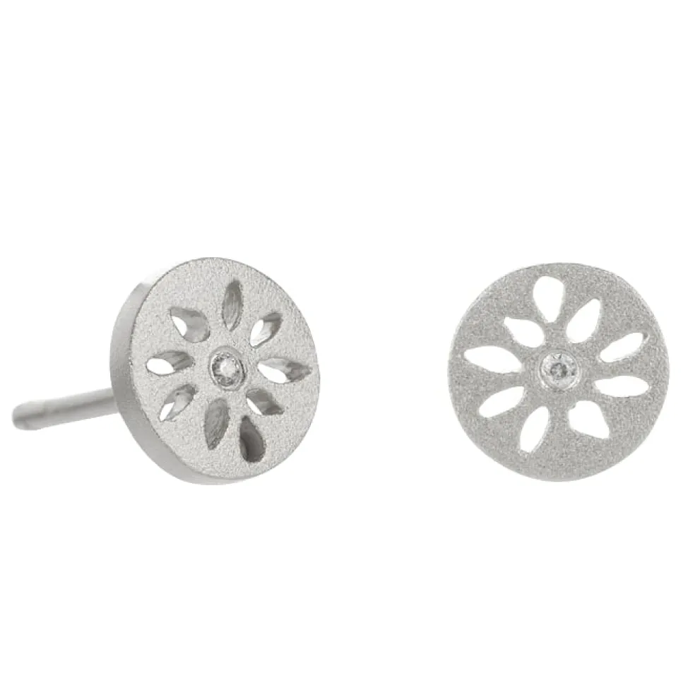 Sølv øre pynt med blomst og lille zirkonia. Ørestikken har en 8mm stor plade hvor blomsten er savet ud. Selv pladen er i mat sølv.