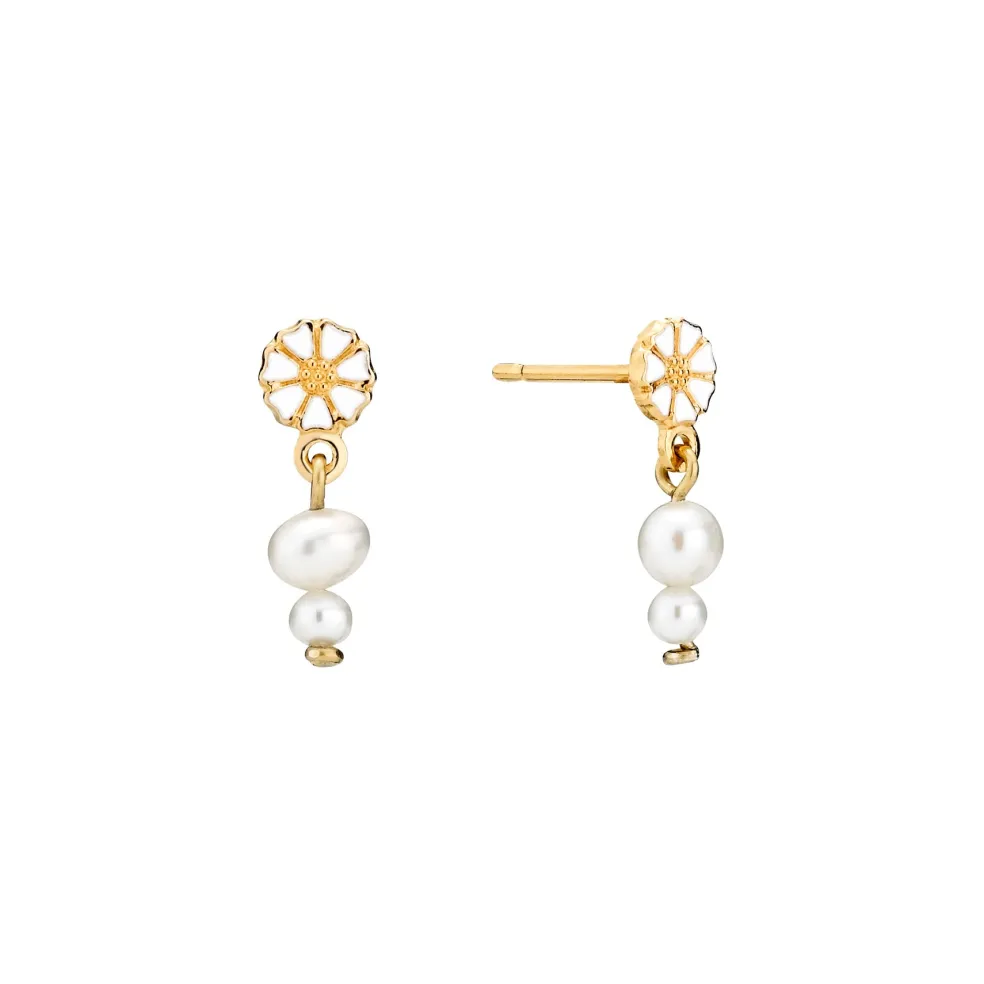 Sølv forgyldt ørestikker med Marguerit og perler. Margueritten er 5mm og den sidder på en stik. Under Margueritten hænger der 2 små smukke perler. En lille fin ørestik der sagtens kan bruges til hul nr 2 i øret.
