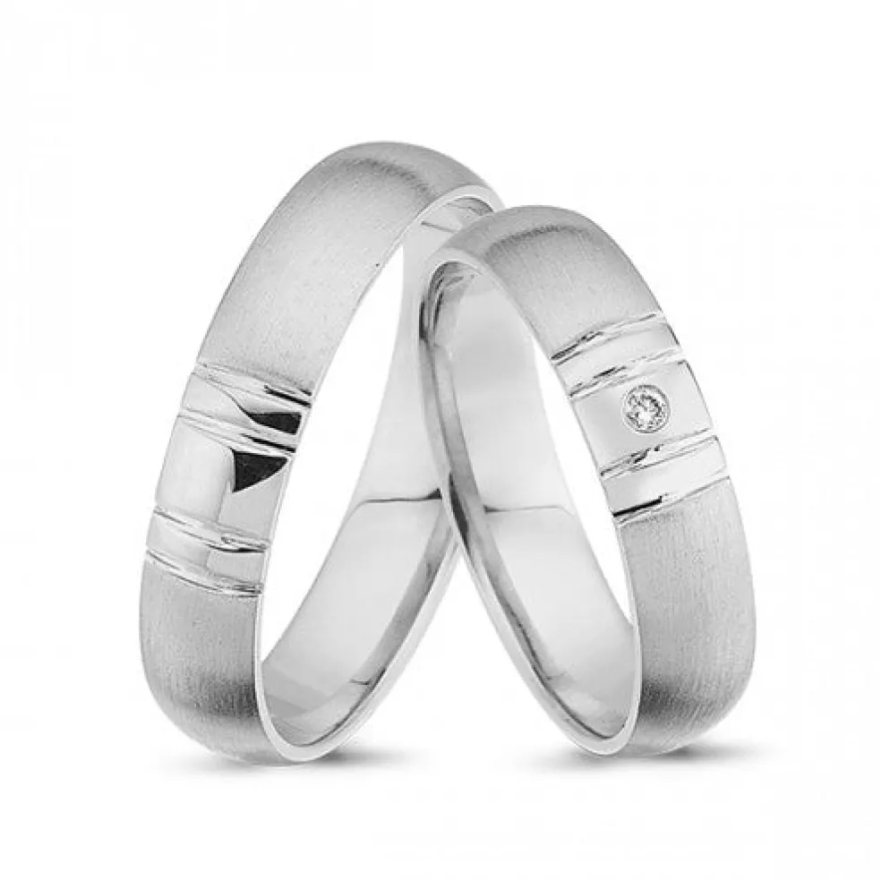 Vielsesringe fra Nuran i 14 karat hvidguld. Ringene er lavet med en silkemat overflade. Bredden på ringene er 5mm. I dame ringen sidder der en 0,01ct W/vs brilliant.