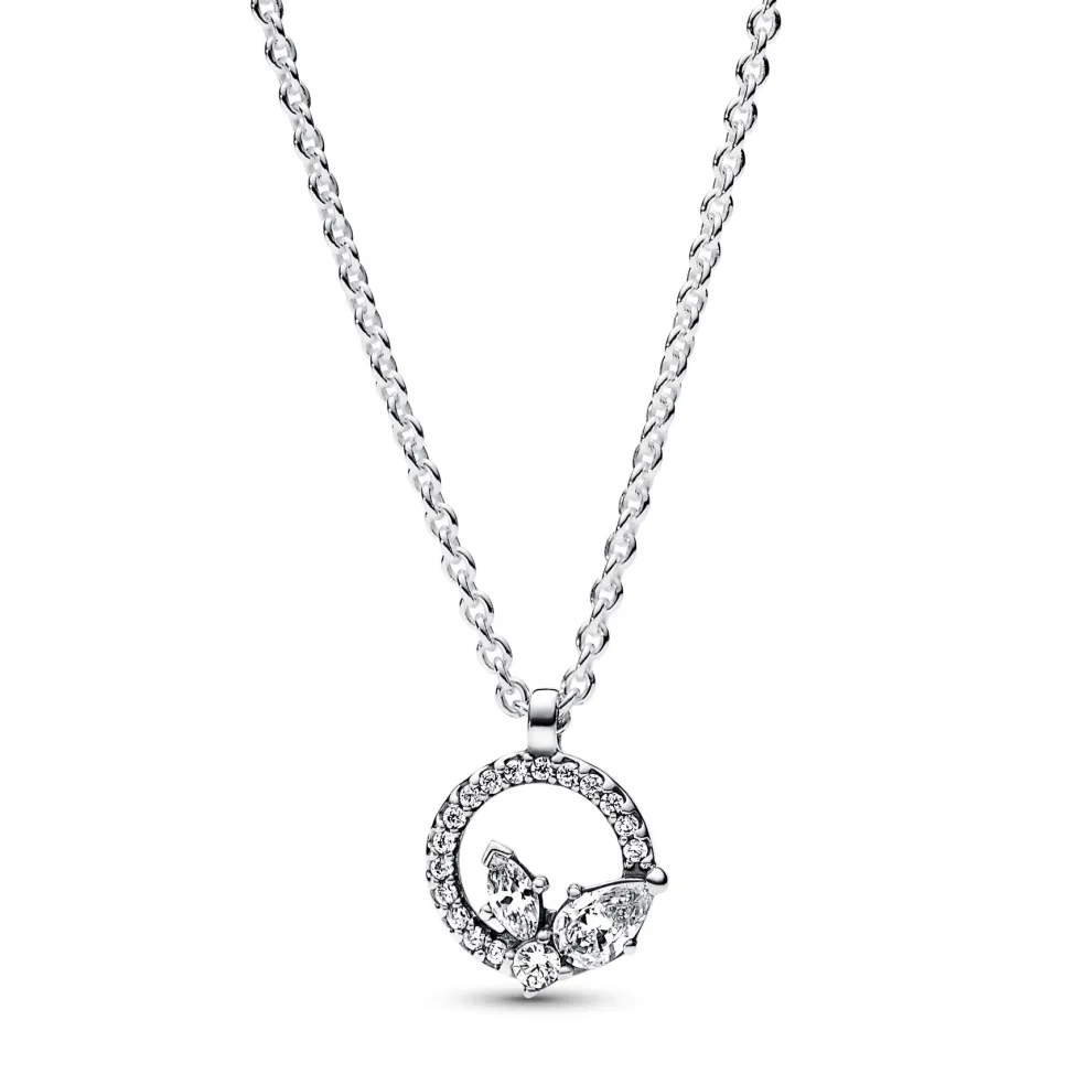 Sølv halskæde med cirkel vedhæng fra Pandora. Vedhænget er besat med funklende sten af zirkonia.