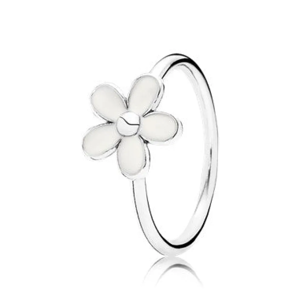 Fin Pandora sølv ring med en lille blomster med hvid emalje