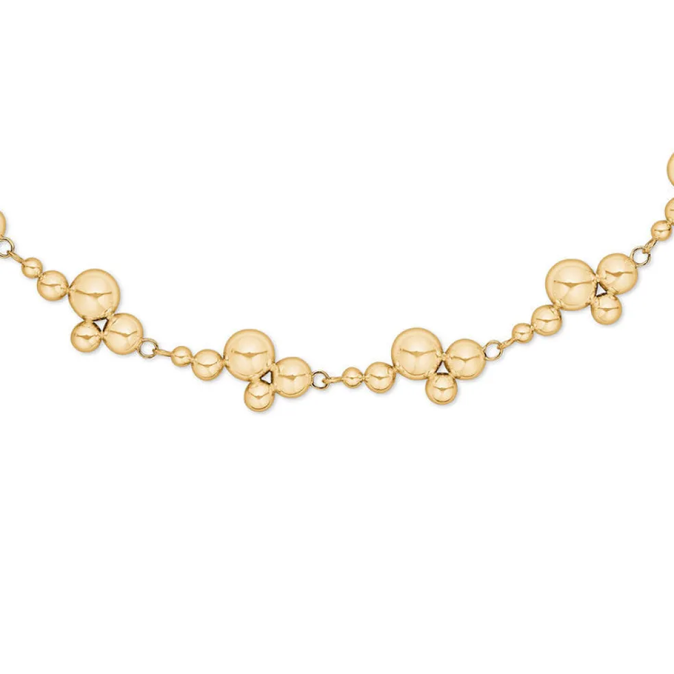 Denne forgyldte sølv halskæde fra Randers Sølv er et elegant og iøjnefaldende smykke, der består af 14 led med halve kugler, som er samlet i drueklaser. Den smukke samling af kugler giver halskæden et stilfuldt og organisk udseende, der kan tilføje både klassisk og moderne elegance til dit look. Halskæden er designet som et collier og måler 45 cm, hvilket gør den perfekt til at sidde tæt omkring halsen for et sofistikeret udtryk.