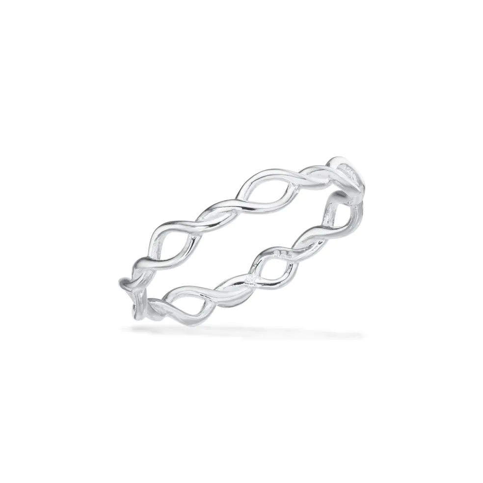 Elegant og klassisk sølvring fra Scrouples, designet specielt til børn og store piger. Ringen har et smukt uendelighedsmønster, der symboliserer evighed og sammenhold. Perfekt som gave til særlige lejligheder som konfirmationer eller fødselsdage. Ringen er en stilfuld tilføjelse til enhver smykkesamling og kan bæres alene eller sammen med andre ringe for et personligt look.