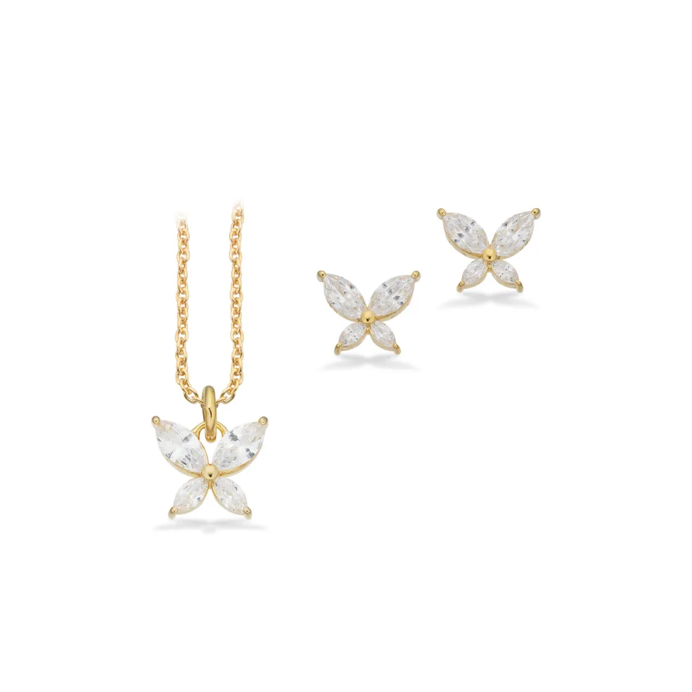 Øreringene matcher halskæden med samme sommerfuglemotiv og ovale zirkonia-sten, hvilket skaber en fin harmoni i sættet.