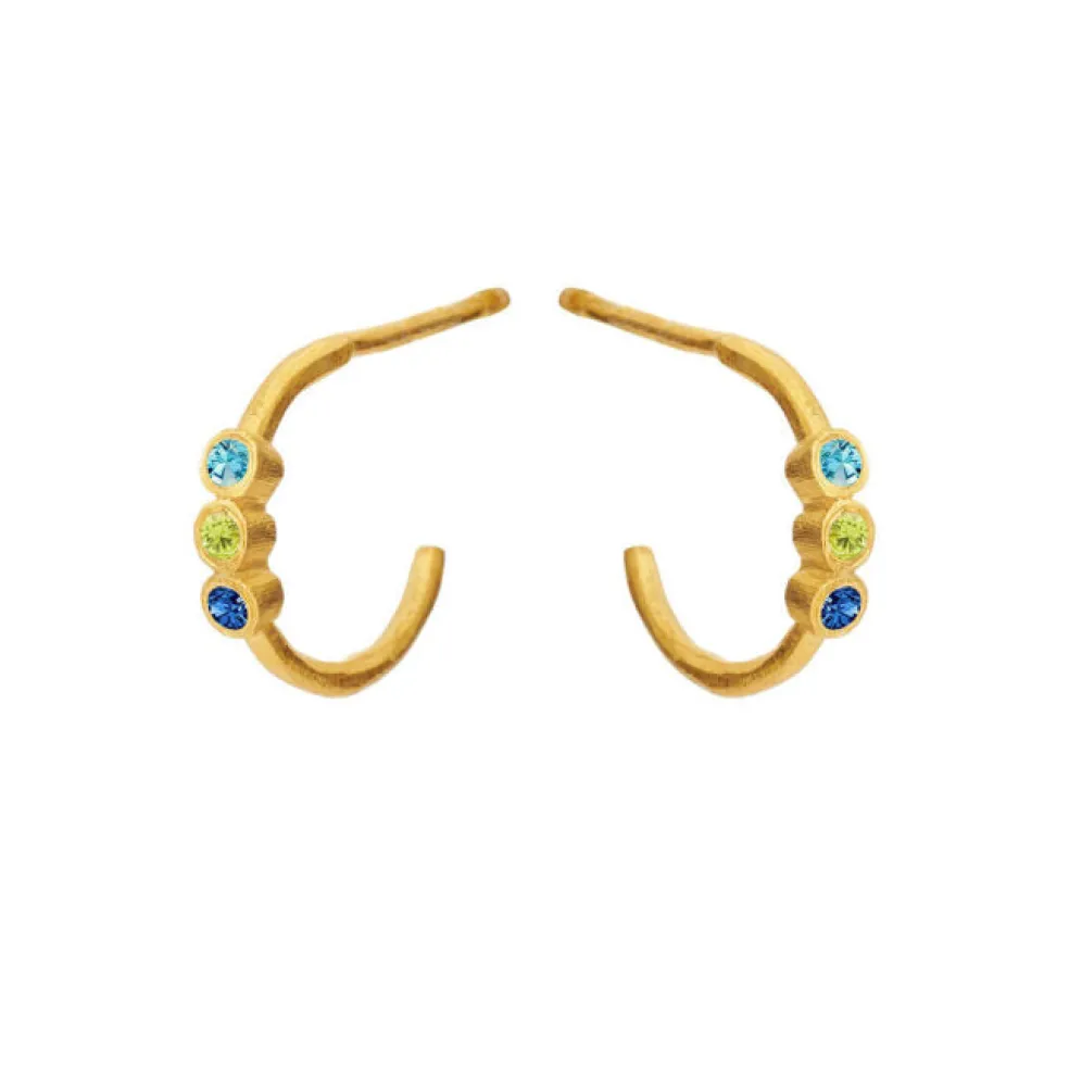 Tilføj et strejf af farve med disse creoler fra Susanne Friis Bjørner. Fremstillet i guldbelagt sterling sølv og dekoreret med tre smukke zirkoniasten i nuancerne grøn, lyseblå og blå, skaber øreringene et unikt og stilfuldt udtryk.