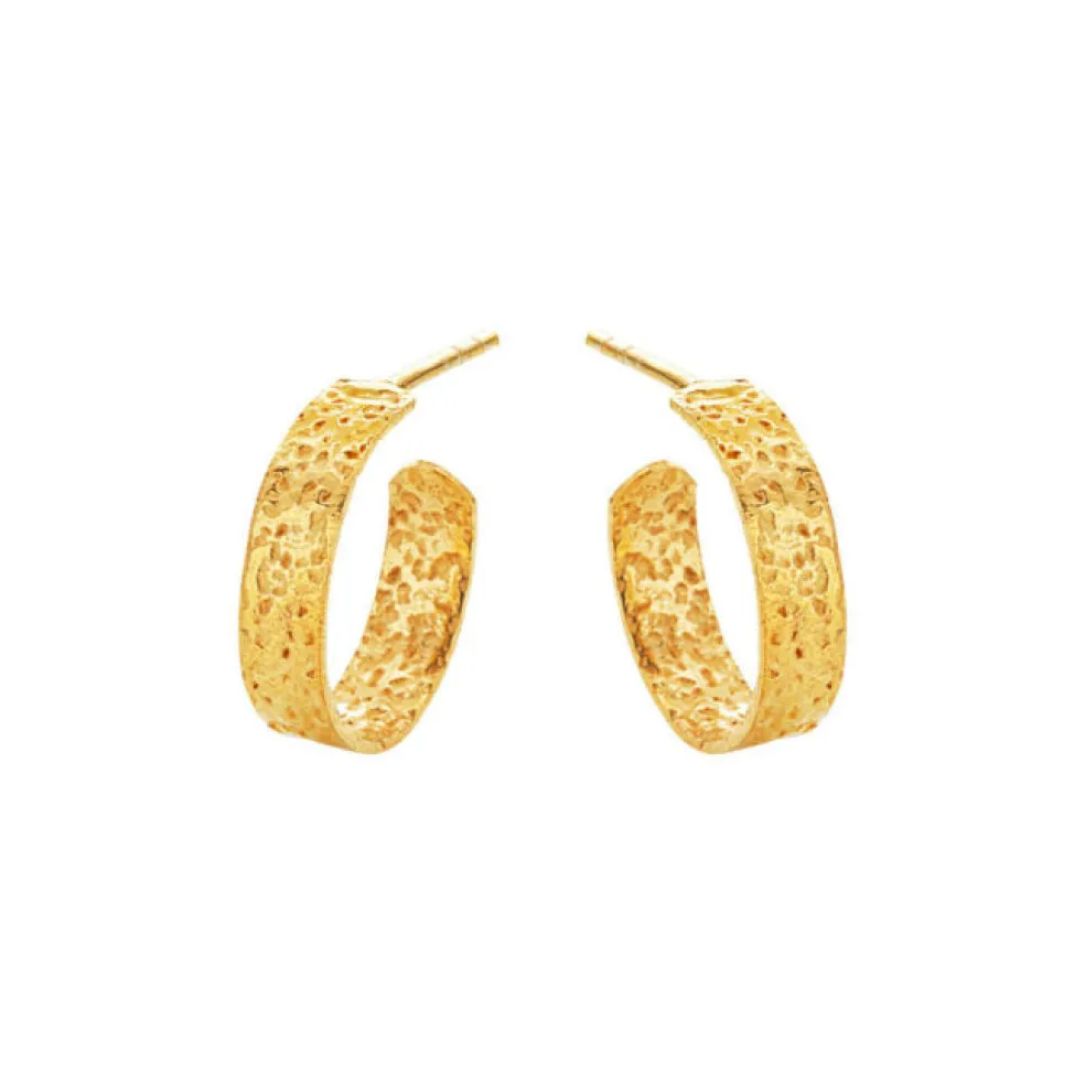 Disse smukke ørecreoler fra Susanne Friis Bjørner er fremstillet i guldbelagt sølv og har en unik rustik overflade, der tilføjer et råt og samtidig sofistikeret udtryk til ethvert look. Creolernes elegante design og rustikke finish gør dem alsidige til både hverdag og festlige lejligheder.