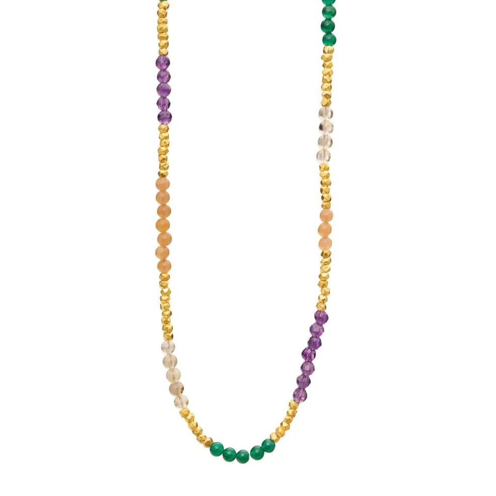 Sten halskæde fra Susanne Friis Bjørner. Kæden består af forskellige ægte sten. Der er ametyst,grøn agat,peach månesten rutil kvarts. I mellem stenene er der forgyldte sølv stykker.