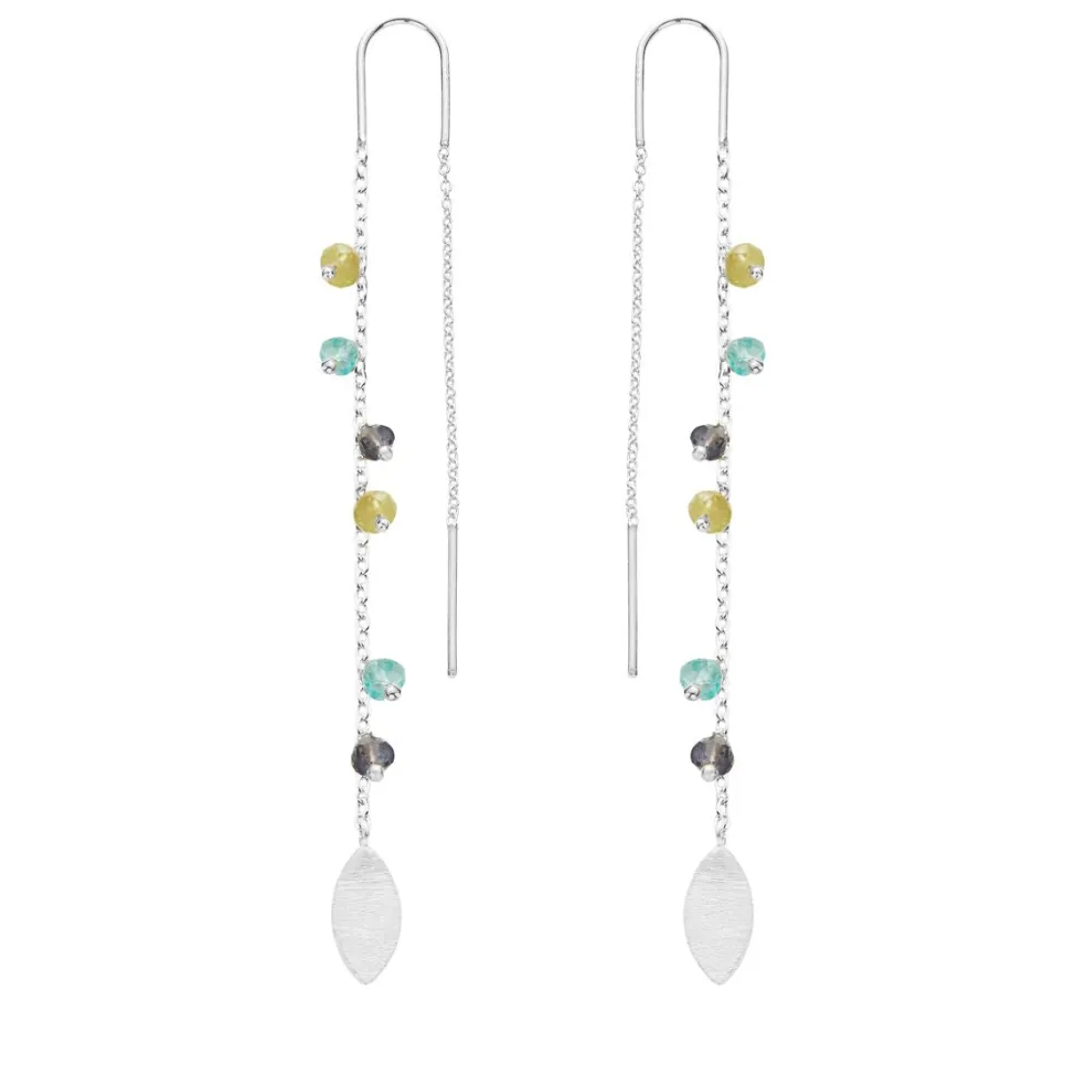Disse smukke øreringe fra Susanne Friis Bjørner er fremstillet i sølv og prydet med forskellige farvede sten, herunder apatit, iolit og peridot. Dette giver et harmonisk farvespil, der fremhæver øreringenes skønne look. Øreringene er designet som kædeøreringe med sten, og i bunden hænger et lille fint blad, der fuldender det smukke udseende.
