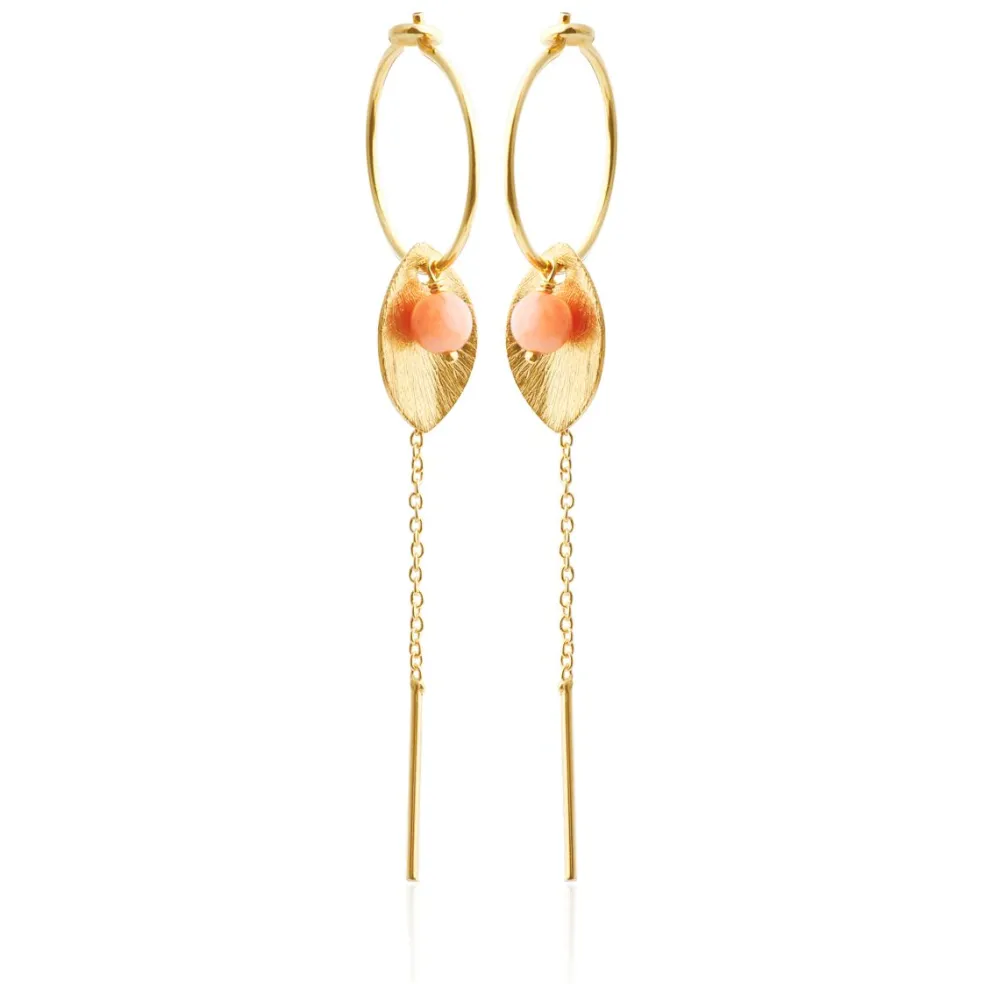 - Materiale: Creolerne er lavet af sølv som er belagt med guld, hvilket giver dem en varm og luksuriøs glans. Den laksefarvede sten af søbambus tilføjer et strejf af naturinspireret skønhed og elegance til smykket.