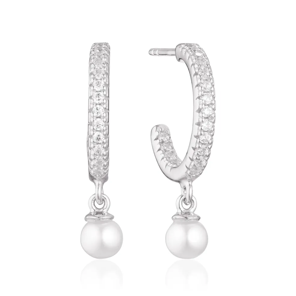 Sølv øreringe som creol med fine glimtende sten og en lille perle, der hænger smuk under creolen. Øreringe er en ørestik med rund ring.