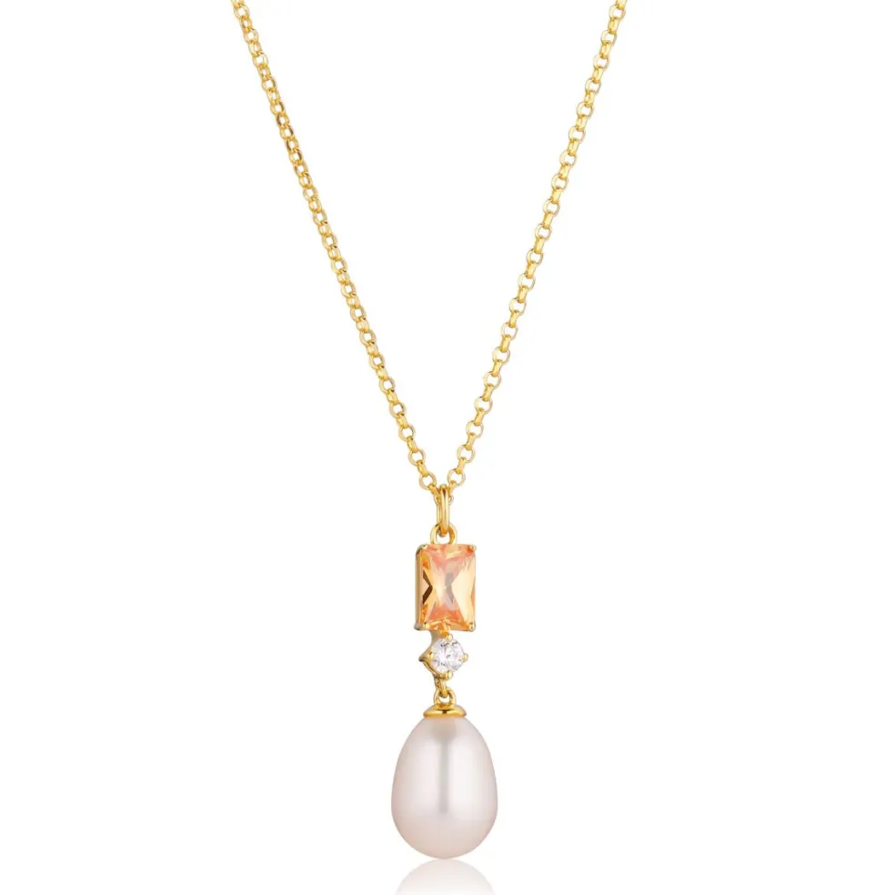 Sølv forgyldt kæde med et vedhæng hvor der er en orange firkantet sten og en lille fin klar zikonia sten. Under stenene hænger der en smuk hvid ferskvands perle. Kæden er en facet anker kæde med slide lås, så du selv kan bestemme længden på kæden. Det længste den kan blive er 50cm.
