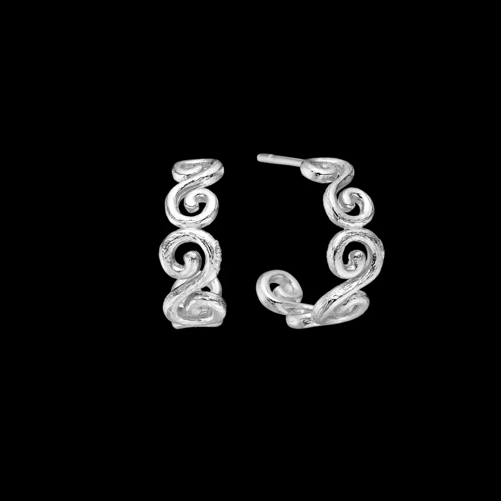 Tilføj et sofistikeret og moderne præg til din smykkesamling med disse elegante sølvcreoler fra Studio Z, en del af Curiosity kollektionen. Øreringene har en smuk, buet form og er dekoreret med et subtilt hamret mønster, der skaber et unikt og moderne udtryk. Designet går omkring øret og giver et flot og dynamisk udseende, der er både tidløst og iøjefaldende.