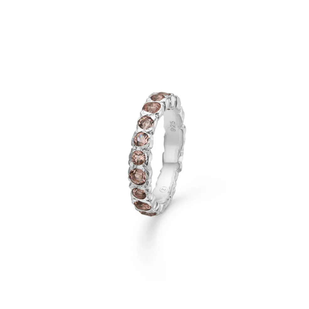 Rosy creek sølv ring fra Studio Z. Ringen har en meget rustik overflade. Ringen har rosa sten af zirkonia på det halve af ringskinnen.