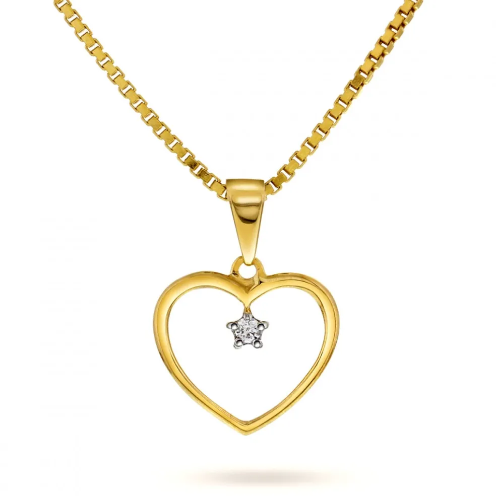 Denne elegante halskæde fra Arne Nordlie består af en smuk forgyldt sølv venezia-kæde med et åbent 14 karats guldhjertevedhæng. Hjertet er prydet med en lille, naturlig diamant i midten, hvilket giver halskæden et tidløst udtryk.
