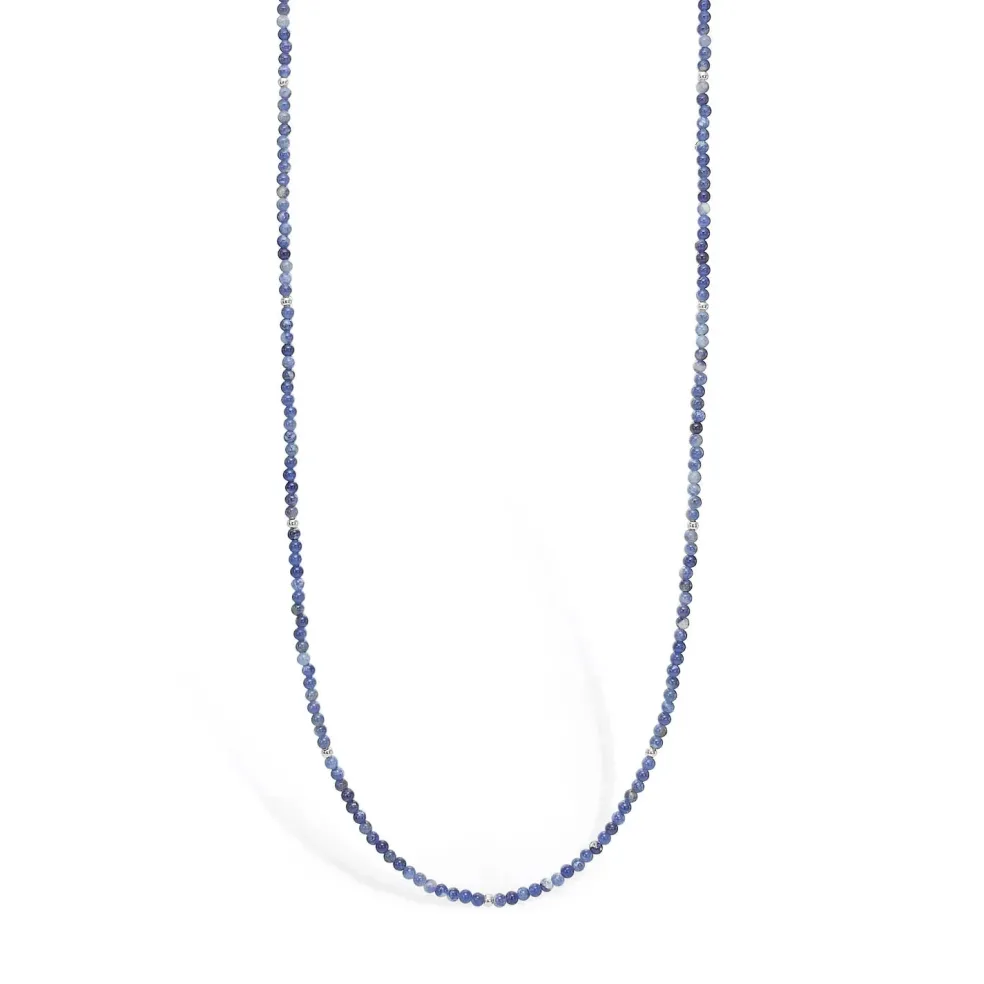 Sølv halskæde med små blå perle sten af jaspis. På halskæden sidder der enkelte små sølv kugler imellem de blå perle sten.