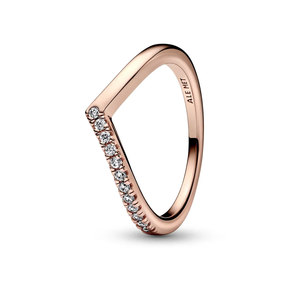 V-Ring med sten på den ene halv del af ringen. Ringen er i Pandoas 14kt rosaforgyldt unikke metalblanding.
