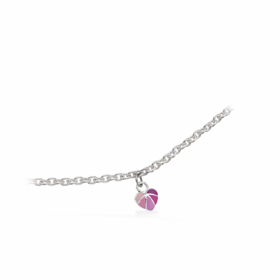 Børnearmbånd i sølv med et lyserødt og lilla hjerte vedhæng. Armbåndet måler 17cm men med mulighed for at lukke det på 14cm.