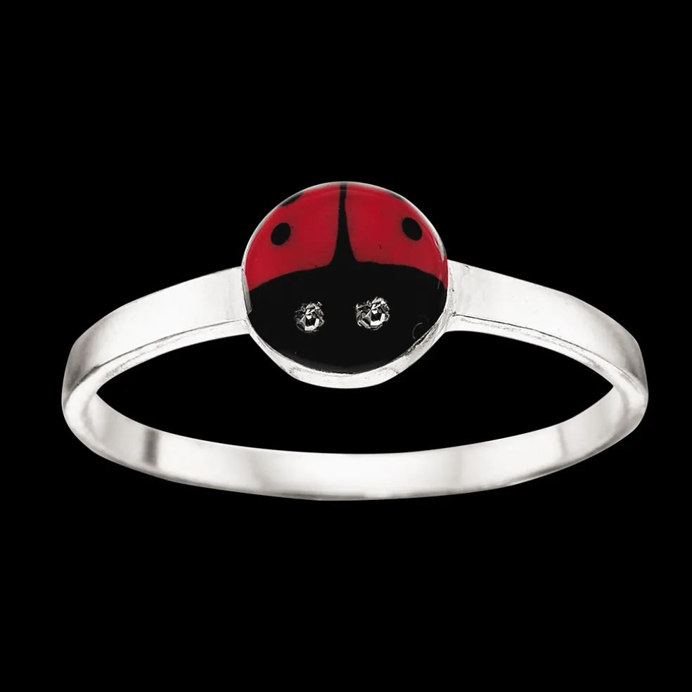 Børnering i sølv med en mariehøne på toppen. Øjne på mariehønen er med sten af zirkonia.