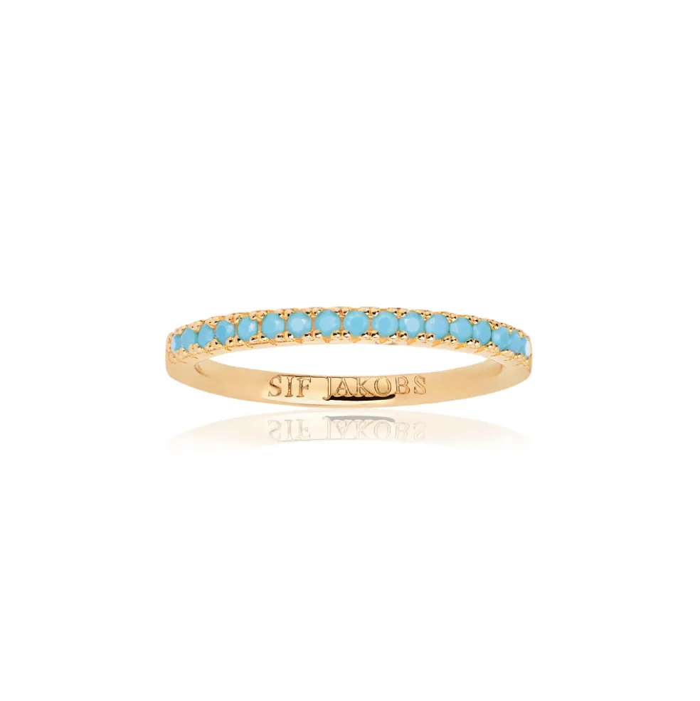 Denne guldbelagte sølv Ellera ring fra Sif Jakobs kombinerer skønhed med en levende farve, hvilket gør den til et iøjnefaldende valg. De turkise sten giver et sommerligt og strålende udtryk, der kan løfte ethvert outfit. Med sin slanke bredde på 2,1 mm er ringen perfekt til at blive båret alene eller i kombination med andre ringe, hvilket gør den alsidig og stilfuld.