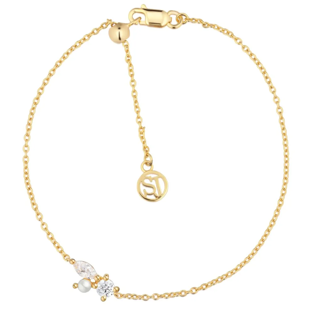 Sølv forgyldt armbånd fra Sif Jakobs. Armbåndet har sten og perler der sidder smukt på toppen af håndledet. Et smukt og elegant armbånd. Låsen er med karabinhage og slide lås, så man kan selv bestemme hvor stramt armbåndet skal sidde.