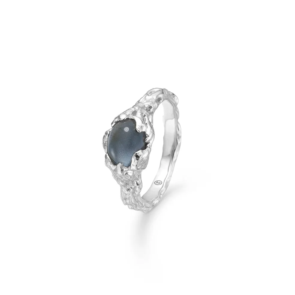 Sølv ring med sten. Stenen er i en blå grå farve. Stenen omfavnes af råt sølv, så det ser ud som at stenen er smeltet ned i sølvet.