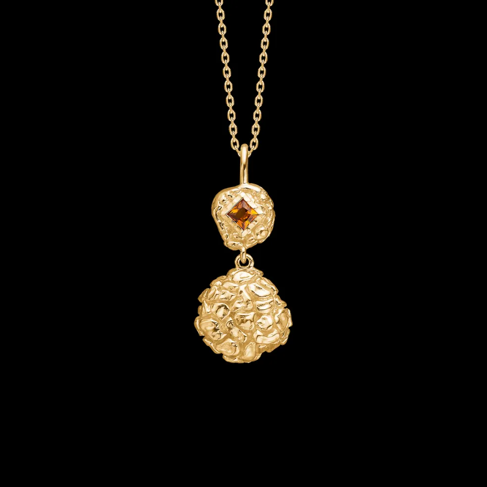 Vedhænget består af to dele: Øverst sidder en funklende orange zirkonia, der tilfører et strejf af farve og liv. Under stenen hænger et bevægeligt vedhæng med en ru og organisk overflade, som skaber en rå kontrast til den skinnende zirkonia.